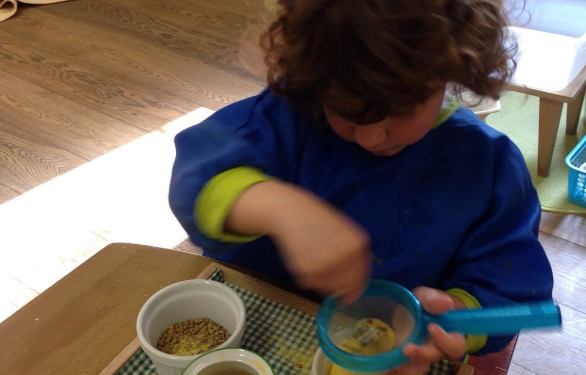 I bambini entrano in una stanza speciale, spaziosa, allestita con ceste e cestini, boule di metallo lucente e ampie bacinelle di plastica colorata. Alcuni di questi contenitori contengono qualcosa di molto interessante: farina di mais, fagioli secchi, riso, noccioli, pastina.