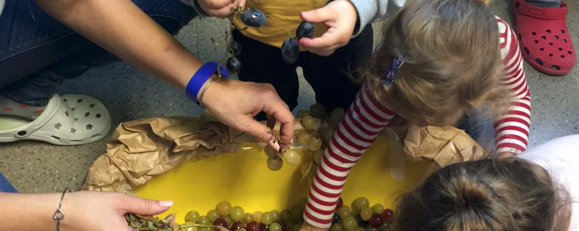 Presso un nido comunale di Siracusa abbiamo provveduto ad organizzare una giornata dedicata alla vendemmia, giornata che ha ricorrenza annuale ed è molto sentita e partecipata sia dai bambini che dalle famiglie. Anche quest’anno la vendemmia del nido è stata un’ottima occasione per vivere un’esperienza ludica e di apprendimento, attraverso una stimolazione sensoriale completa a forte connotazione operativa/emotiva, in un clima di partecipazione e collaborazione che ha favorito l’autonomia nel fare dei bambini e delle bambine. Accanto alla vendemmia abbiamo voluto proporre una castagnata, e, per aiutare i bambini a creare un quadro di riferimento sensoriale e cognitivo, prima della giornata in questione abbiamo proposto dei momenti di esplorazione relativi all’uva e alla castagna. L’aspettativa della giornata è stata creata parlando di ciò che sarebbe successo e illustrando ai bambini con un linguaggio semplice ma corretto gli elementi principali della vendemmia. Abbiamo poi allestito la preparazione all’ambiente con i materiali necessari, dall’abbigliamento adatto (da contadino potremmo dire) alla raccolta e pigiatura dell’uva.