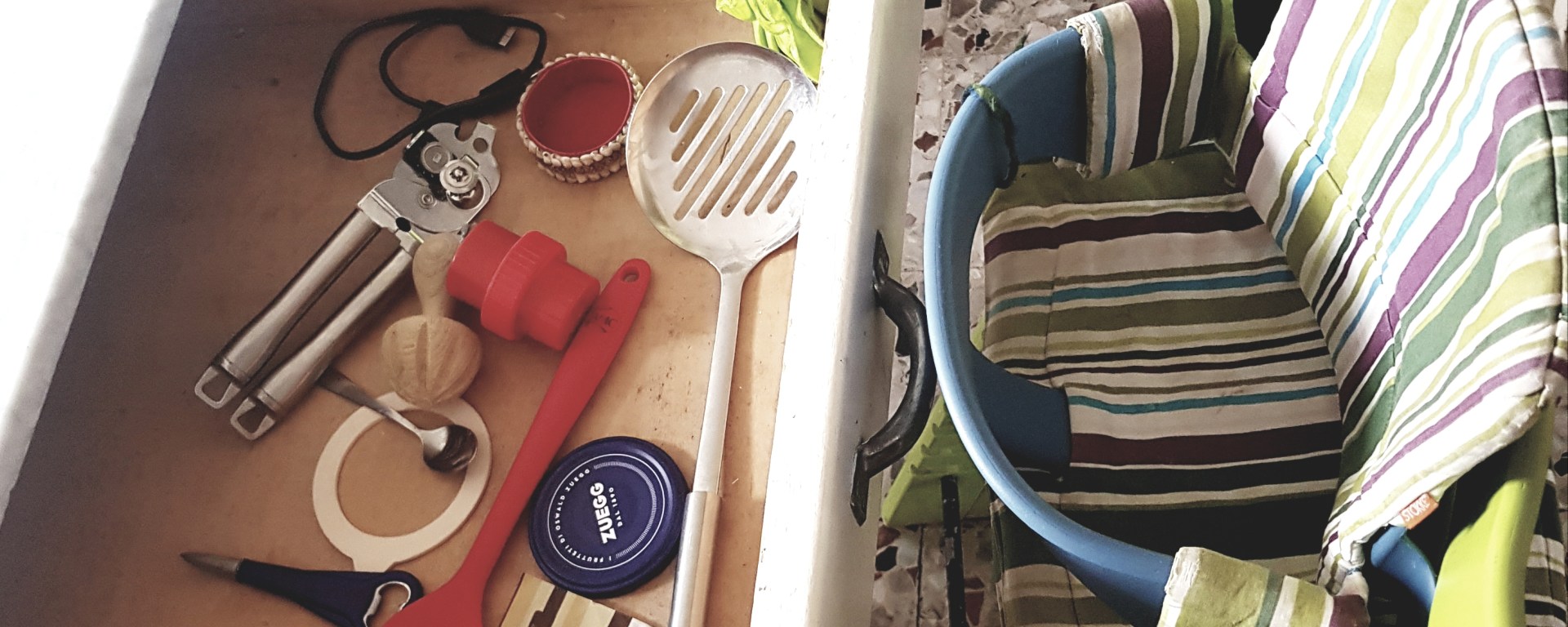 In questi giorni sono tante le famiglie che si dedicano con ritrovato impegno alla cucina: papà, mamma e bambini si mettono attorno alla tavola e impastano, tagliano, riempiono, condiscono. A partire dai 18 mesi i bambini si sentono coinvolti nelle pratiche culinarie, ma prima di solito il desiderio di esplorare prevale su qualunque attivitá, pertanto é facile che il nostro bimbo di 7 o 12 mesi non riesca a partecipare all’impasto della pizza o degli gnocchi o alla stesura delle tagliatelle. Tuttavia egli prova tanto piacere nel condividere con la famiglia tutti i momenti comunitari, perciò possiamo dedicargli un angolo del tavolo tutto per lui, nel quale starà mentre noi cuciniamo: poiché la sua mente ha bisogno di nutrimento almeno quanto il suo corpo allestiremo per lui un cestino, o, meglio ancora, un cassetto tutto per lui (se il tavolo ha dei cassetti), ricco di oggetti di cucina (una decina), quali un cucchiaio di legno, un mestolino, un apribottiglie, uno spremiaglio ecc, che il bambino, seduto sulla sua sedia, possa prendere. L’importante é che gli oggetti siano maneggevoli e non pericolosi, ovvero né taglienti né acuminati, né tanto piccoli da poter soffocare il piccolo.Il bambino si divertirà ad aprire e chiudere il cassetto, e potrà tirare fuori gli oggetti, esplorarli, portarli alla bocca, lasciarli cadere (armatevi di pazienza e raccogliete sempre ciò che butta per terra, per lui é un esercizio importante!) o rimetterli dentro, mentre i genitori e i fratelli cucinano, o anche quando studiano o lavorano al pc.