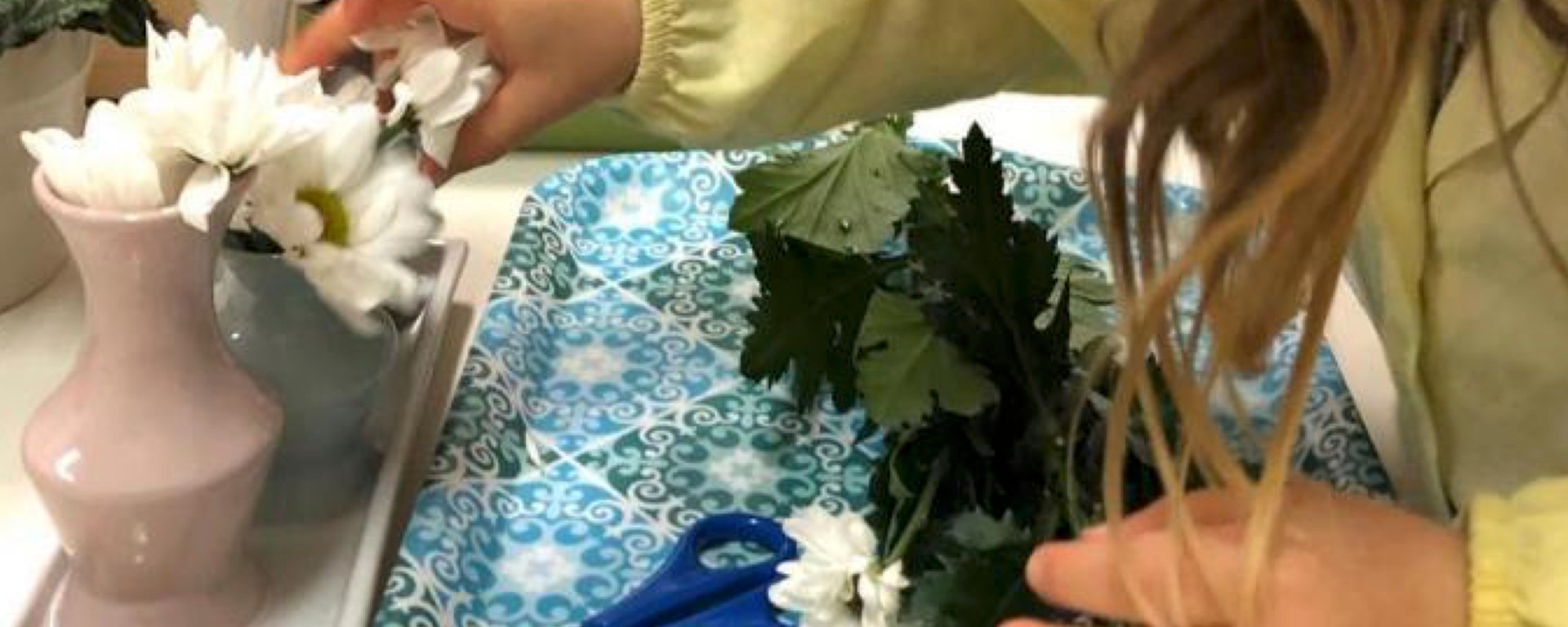 Ora prepara il secondo vassoio mettendo un paio di forbici, dei fiori e un contenitore con alcune bottigliette.